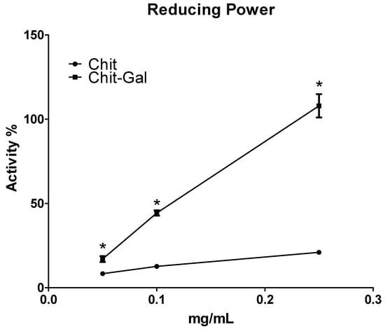 The reducing power test evaluates a molecule’s ability to donate electrons. Figure 9 shows the reducing power obtained for the samples. Chit presented with 20% reducing power at the maximum concentration evaluated, and GA conjugated to Chit conferred 100% activity. The activity observed for Chit was similar to that observed with other Chit molecules [,,]. Conjugation of GA resulted in a significant increase in observed activity. GA shows significant activity in this test [], and at 250 μg/mL Chit-Gal, approximately 2.5 μg/mL of GA was present. Although the mass of this molecule would suggest significant activity, this alone does not justify the 100% activity observed in the test. Thus, the activity observed in this test can be justified by the connection between the two molecules, which led to the formation of a molecule with a reducing power that combined the potentials of both molecules. Xie et al. [] also reported that conjugation of GA to Chit resulted in a greater reducing power than the individual precursors, which corroborates data obtained in our study.