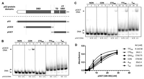 To examine the roles of both p53 DNA binding domains (Figure 2A) in p53 TNR slipped-strand mimicking substrate recognition, we analyzed the DNA interactions of isolated p53 core domain (p53CD, aa 94–312, Figure 2B) and p53 C-terminal segment (p53CT aa 320–393; containing p53CTDBD and tetramerization domains, Figure 2C,D). Binding of p53CD and p53CT to CTGNB hairpin, TTCNB and TNB was compared with their binding to the CON (Figure 2B,C, lanes 4–6) and a non-specific DNA sequence (NON, Figure 2B, C lanes 1–3). Importantly, although p53CD was able to form a specific complex with the consensus sequence under the experimental conditions (Figure 2B, lanes 4–6), it was unable to form a stable complex with any of the structure-specific substrates (Figure 2B, lanes 7–15). In contrast to p53CD, binding of p53CT to non-B DNA substrates (CTG hairpin, TTCNB and T-loops) was clearly selective over binding to duplex CON or NON substrates (Figure 2C). The ELISA system (Figure 2D) confirmed p53CT binding to TNR with often higher affinity than to p53CON, it also demonstrated p53CT preference for TTCNB over GAANB. Overall, the C-terminal region of p53, containing CTDBD and tetramerization domain, seems to be chiefly responsible for p53 TTCNB recognition. This corresponds to data acquired by Walter et al. [18], who observed decreased p53 binding to CTG or CAG hairpins upon obstructing the p53 C-terminus by PAb421, an antibody mapping to the C-terminal region.