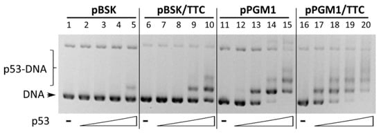 - Walter, K.; Warnecke, G.; Bowater, R.; Deppert, W.; Kim, E. tumor suppressor p53 binds with high affinity to CTG.CAG trinucleotide repeats and induces topological alterations in mismatched duplexes. J. Biol. Chem. 2005, 280, 42497–42507. [Google Scholar] [CrossRef]