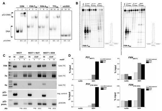 As for frataxin, a p53-responsive element was recently found in the proximal FXN promoter [28,29] and FXN was identified as a p53 target gene. The dysfunction of p53 by mutation in cancerous cells was found to decrease the expression of frataxin and deregulate mitochondrial iron homeostasis, similarly to Friedreich’s ataxia disease [29]. However, the previously investigated area did not cover the TNR region, which as we show may add a new regulatory feature to the p53–frataxin interplay.