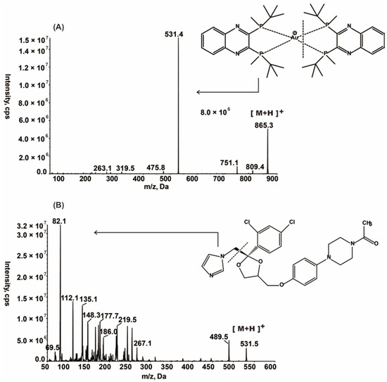 Product ion mass spectra of (A) GC20 (m/z 865.3→531.4), scan range 50–900 amu; (B) IS (Ketoconazole) (m/z 531.5→82.1), scan range 50–600 amu in the positive ionization mode.