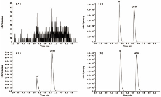 GC20 and IS were separated on a 50 mm × 2.10 mm, 3.5 μm ZORBAX 80A Extend-C18 column (Agilent, Santa Clara, CA, USA). The chromatography was performed at 40 °C, under gradient conditions. Gradient mobile phase system consisting of 0.1% formic acid added with 5 mM ammonium formate (A) and methanol (B) was applied at a flow rate of 0.3 mL/min. Retention times of GC20 and IS were 6.6 and 5.2 min, respectively. A typical injection of 5 μL was sufficient to obtain the required sensitivity. Run time of 10 min with a gradient elution: 0.0–1.0 min (10% B), 1.0–4.5 min (10–70%B), 4.5–6.5 min (70–95% B), 6.5–7.0 min (95–10% B), 7.0–10.0 min (10% B) were used.