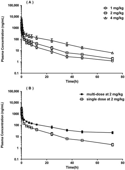 Mean plasma concentration-time profiles (semi-log graph) of GC20 in rats: (A) after intravenous administration of GC20 at three single doses (1, 2, 4 mg/kg); (B) after consecutive administration of GC20 for 7 days at 2 mg/kg compared to single administration of GC20 at 2 mg/kg. The data are expressed as mean ± SD from all rats in each dosing group (n = 6).