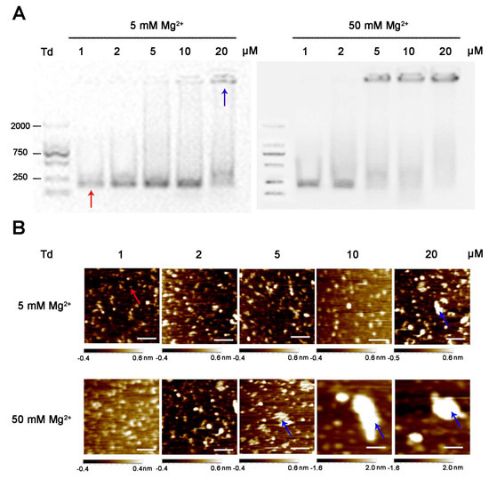 Characteristics of tetrahedrons (Tds) (1, 2, 5, 10 and 20 μM) prepared in 5 and 50 mM Mg2+. (A) Agarose gel of DNA products. (B) AFM images of DNA products. Scale bars: 100 nm. Red and blue arrows represent successfully assembled Td and aggregated DNA, respectively.
