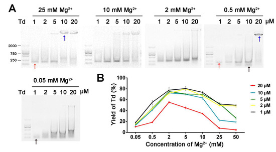 The influence of Mg2+ and Td concentrations on preparing Td in micromolar ranges. (A) Agarose gel of 1, 2, 5, 10 or 20 μM DNA products under various Mg2+ concentrations. (B) Yield curve of Td versus Mg2+ and Td concentrations. Red, blue and black arrows represent successfully assembled Td, aggregated DNA and free DNA strands, respectively.