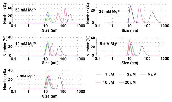 Next, we further clarified the role of Mg2+ in the self-assembly process of Td by synthesizing Td in TM buffers containing diverse Mg2+ concentrations (0.05, 0.5, 2, 10 and 25 mM MgCl2). The electrophoresis results (Figure 2A) show that different concentrations of Td were assembled in 2 mM MgCl2. However, 1, 2 or 5 μM Td could be assembled in 25 mM Mg2+, and aggregation appeared when the concentration of DNA increased to 10 or 20 μM. Nevertheless, the samples of 10 or 20 μM prepared in lower Mg2+ density (0.5 and 0.05 mM) also showed poor yields, and bands with faster mobility were observed in the electrophoresis results, indicating the existence of free DNA strands. The dynamic light scattering (DLS) results further confirm that the successfully prepared Td had a hydrodynamic size of ~12.36 nm, and when aggregation occurred, the particle sizes increased with an increase of Mg2+ concentration (Figure 3). The polydispersity index (PDI) values of products are listed in Table S2, indicating that greater particle heterogeneity as aggregation occurred. (Only particles larger than 3 nm can be measured in this apparatus; therefore, the DLS results of the Td prepared in 0.05 or 0.5 mM Mg2+ were not available.)