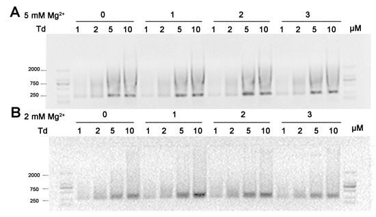 After estimating the yields of Td in various environments by gray scanning (Table S3 and Figure 2B), we found that adequate Mg2+ intensity is the first condition for constructing high-yielding Td; this observation was based on the fact that yields decreased dramatically to less than 20% in 0.05 mM Mg2+, no matter what concentration of DNA nanostructures was prepared. Notably, DNA in higher concentrations is more vulnerable to the change in Mg2+ density. As illustrated in Table S3, when the concentration of Mg2+ changed from 2 mM to 25 mM, the yield of 20 μM Td slumped from 55.4% to 7.8%, while that of the 1 μM sample decreased from 77.53% to 52.22% (Table S3).