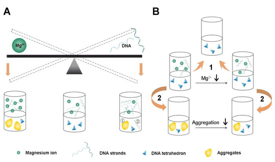 Illustrative diagram demonstrating the influence of different concentrations of Mg2+ and DNA on the processes of preparation, freezing-thawing and lyophilization of Td. (A) The balance between concentrations of Mg2+ and DNA strands when preparing Td. There is an appropriate range of Mg2+ concentrations for the successful assembly of Td. A higher concentration of Mg2+ (>10 mM) results in an apparent aggregation of the DNA, while a lower concentration of Mg2+ (<2 mM) leads to an insufficient assembly of Td. Similarly, if the concentration of DNA reaches the upper limit (20 μM), pronounced aggregation also makes the assembly fail. Therefore, successful self-assembly of the Td can only be achieved by maintaining the balance of the two ingredients. (B) Freeze-thawing has no influence on the structure of the formed Td (1), but lyophilization increases the risks of Td aggregation, which would be largely attenuated by reducing the concentration of Mg2+ in the initial prepared buffer (2).