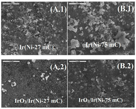 SEM micrographs depict the morphology of the catalyst surface and, combined with EDS analysis, confirm the presence of Ir deposits on Ni. Figure 1(A.1,B.1) present the surface morphology of “27 mC” and “75 mC” Ir(Ni)/GC samples, prepared by Ir galvanic deposition on 27 and 75 mC electrodeposited Ni films (136 and 363 nm thick) on a GC substrate. Figure 1(A.2,B.2) present the corresponding IrO2/Ir(Ni)/GC catalysts prepared by subsequent anodization of the samples shown in A.1 and B.1 (by 10 potential sweep cycles at 50 mV·s−1 between −0.30 and +1.15 V vs. SCE-see next sub-section). Brighter areas are attributed to thick Ir or IrO2/Ir particles, grey areas to thinly-coated Ni areas or passive Ni oxides whereas dark areas are linked to parts of the GC substrate that have been revealed during the replacement and/or anodization process. Larger Ir particles seem to form on the “75 mC’’-thicker Ni precursor sample and a thinner and more porous film results from the “25 mC”-thinner Ni precursor sample. Overall, there is good coverage of the surface without a dramatic change when passing from as-prepared ((A.1), (B.1)) to anodized samples ((A.2), (B.2)); the latter observation indicates fast Ir deposition and significant Ni protection-coverage by Ir and is more pronounced in the case of the thin film (fewer changes in morphology upon anodization) when compared to the thicker film (where some large Ir particles seem to collapse, because of neighboring Ni areas dissolving during the electrochemical treatment).