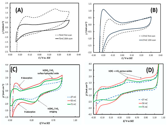 Prior to anodization, the “27 mC”, “50 mC” and “75 mC” samples, as received from the galvanic replacement process, underwent cyclic voltammetry in a limited potential range to confirm the presence of metallic Ir by its typical Ir surface electrochemistry and dissolve/passivate any unreacted surface Ni. Hence, the Ir-Ni/GC electrodes were scanned in a deaerated solution of 0.1 M HClO4 at a voltage scan rate of 50 mV·s−1 in the potential range of (a) underpotential adsorption/desorption of a hydrogen monolayer/submonolayer on Ir starting at ca. −0.10 V (Figure 3A,B) and (b) reversible Ir surface oxide/hydroxide formation and reduction at ca. +0.55 V/+0.30 V respectively (Figure 3C).