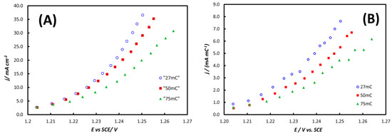 Figure 5A,B below present the steady-state current density vs applied potential, corrected for the uncompensated resistance, for three IrO2/Ir(Ni)/GC electrodes of different Ni-precursor film thicknesses (“27 mC”, “50 mC”, “75 mC”). The current density is normalized both per electrode geometric area (A) and the charge of the anodically grown IrO2 (B), the latter being representative of the electroactive area of porous IrO2.