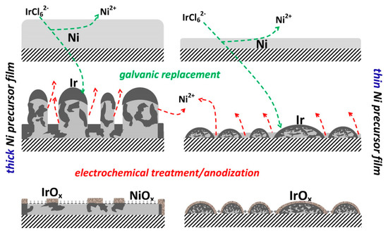 Proposed mechanism for film morphology and composition evolution during the galvanic replacement of Ni layers by Ir, followed by electrochemical treatment and anodization, for thin and thick Ni precursor films.