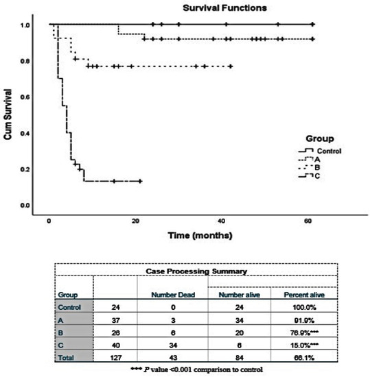 Kaplan-Meier survival analysis. Kaplan-Meier plots representing the correlation of NF-κB gene expression and survival. Group (A) < 5-fold increase, (B) 5-10 fold, (C) > 10 fold. Patients with low gene expression had longer survival time than those with high expression. For Kaplan-Meier plots, the log-rank test was applied. The log-rank test p value indicates the significance of the correlation.