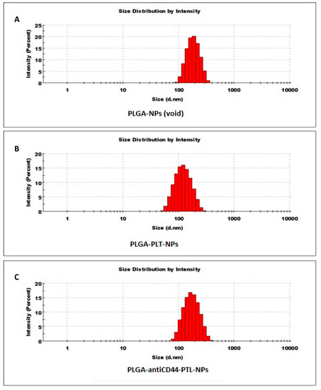 Size measurement of nanoparticles using Dynamic Light Scattering (DLS). (A) Void PLGA nanoparticles (PLGA-NPs). (B) PLGA nanoparticles encapsulating parthenolide (PLGA-PTL-NPs). (C) PLGA nanoparticles with antiCD44 and encapsulating parthenolide (PLGA-antiCD44-PTL-NPs). Abbreviations: NP, nanoparticle; PLGA, poly lactide co-glycolide; PTL, parthenolide.