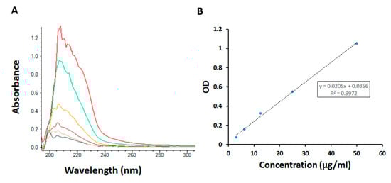 Determination of amount of parthenolide (PTL) encapsulated in poly lactide co-glycolide (PLGA) nanoparticles. (A) UV-VIS spectra used to construct the standard curve (B), with concentrations of PTL of 1.6, 3.2, 6.25, 12.5, 25.0, and 50.0 µg/mL.