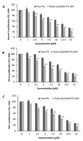 Cell lines’ proliferation with free parthenolide (PTL) and PLGA-antiCD44-PTL-NPs measured with MTT assay. (A) Kasumi-1 cell line, (B) KG-1a cell line, (C) THP-1 Lucia cell line. Shown with free PTL and PLGA-antiCD44-PTL-NPs at 1.0, 2.5, 5, 7.5, 10, 12.5, and 15 µM. Cell proliferation (% of control) is expressed as mean ± S.E.M., n = 3. One-way ANOVA was used followed by the Newman-Keuls post-test (* p < 0.05, ** p < 0.01 compared to free PTL). Abbreviations: NP, nanoparticle; PLGA, poly lactide co-glycolide; PTL, parthenolide.