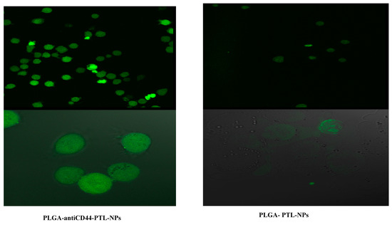 We compared the effectiveness of PLGA-antiCD44-PTL-NPs with PLGA-PTL-NPs using confocal microscopy. For both delivery systems, the nano shell (PLGA) was tagged with fluorescent FTIC. Photographic and fluorescent images showed greater uptake of PLGA-antiCD44-PTL-NPs in comparison to PLGA-PTL-NPs by leukemic cells (Figure 6).