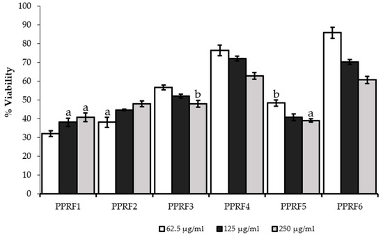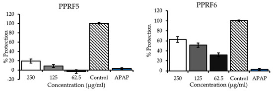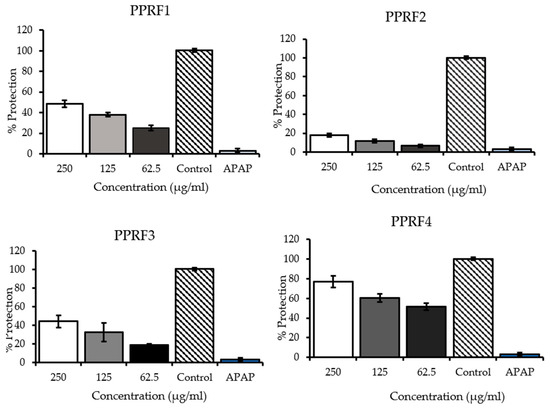 The possible hepatoprotective effects of the PPRFs against acetaminophen-induced cytotoxicity were determined by pre-incubating the cells with or without the PPRFs. APAP at a dose of 100 mM decreased cell viability to 10% of the control cells. Significant dose-dependent protection toward cell toxicity resulting from APAP exposure was observed in the treated cells with the PPRFs (Figure 3). PPRF4 showed the highest percentage of protection with 77% of the control at 250 μg/mL compared to 62% shown by PPRF6 at 250 μg/mL, whereas PPRF2 and PPRF5 showed the least protection at 250 μg/mL, with 18% and 19%, respectively.