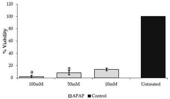 Cytotoxic effect of APAP on HepG2 cells after 24 h treatment. Values are means ± SD percentage of control from three replicates of independent experiments. Bars with the same letters are not significantly different (p < 0.05). APAP: Acetaminophen.