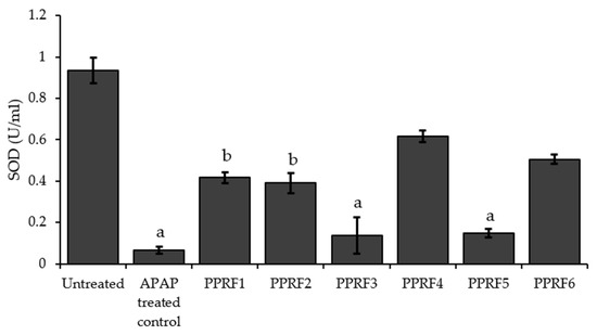 The treatment of the HepG2 cells with APAP significantly (p < 0.05) decreased the SOD concentration compared to the untreated. All the PPRF-treated cells showed a significant increase in the SOD levels, except PPRF3 and PPRF5, both of which were not significantly different compared to the APAP-treated cells (Figure 4).