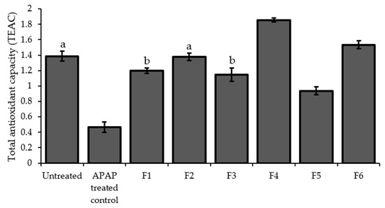 The effect of PPRFs on the total antioxidant capacity of APAP-treated HepG2 cells. The values (mean ± SD) from three replicates of independent experiments and are expressed as Trolox equivalents (TEAC). Bars with the same letters are not significantly different (p < 0.05). APAP: Acetaminophen.