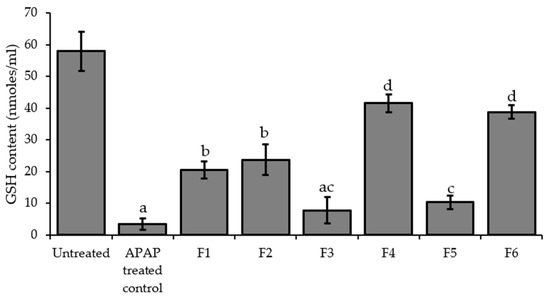 The effect of PPRFs on the GSH content of APAP-treated HepG2 cells. The values (mean ± SD) from three replicates of independent experiments. Bars with the same alphabets are not significantly different (p < 0.05). APAP: Acetaminophen.