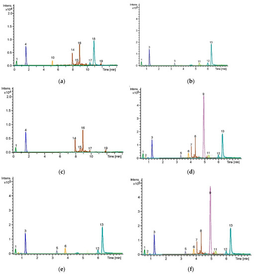 Extracted ion chromatograms (EICs) of the PPRFs by UHPLC-MS. (a) PPRF1 (b) PPRF2 (c) PPRF3 (d) PPRF4 (e) PPRF5 (f) PPRF6.