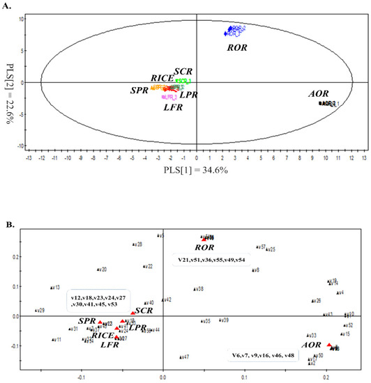 Partial least squares-discriminant analysis (PLS-DA) score plot for volatile compounds profiles in fermented rice inoculated by different microbes. (A) Score plot, (B) loading plot. AOR = Aspergillus oryzae, ROR = Rhyzopus oryzae, SCR = Sacharomyces cerevisiae, SFR = Saccharomycopsis fibuligera, LFR = Lactobacillus fermentum, LPR = Lactobacillus plantarum, RICE = controls (non-fermented rice).