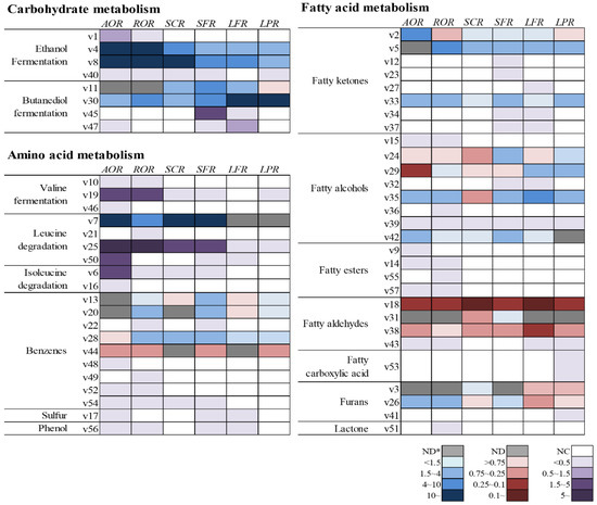 During fermentation, lipids can be hydrolyzed to glycerol and fatty acids by lipase. The fatty acid metabolic pathway includes both fatty acids and their derivatives. There are various volatile compounds derived from fatty acids, including furans, lactones, and volatile compounds derived from fatty acids (aldehydes, acids, ketones, and esters). β-Oxidation, which is a main fatty acid breakdown pathway, converts fatty acids into two carbon segments (acetyl-CoA), then, further enzymatic activities, such as decarboxylation, oxidation, reduction, and so on, catalyze the formation of aldehydes, alcohols, ketones, acids, and esters [29]. Esters derived from fatty acids, such as ethyl propanoante, ethyl butanoate, ethyl tetradecanoate, and ethyl hexadecanoate, were only detected in AOR and ROR. These volatile compounds can be formed by esterification, combining fatty acids and ethanol, which is catalyzed by esterase [29]. A marked content of ethanol was observed in AOR, ROR, and SCR, while fatty acid esters were not found in SCR. It might be assumed that the different activity of esterase of the individual microbes could affect the formation of fatty acid esters. In addition, higher numbers of ketones were detected in SFR than in other samples in this study.
