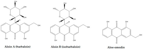 Aloin A, aloin B, and aloe-emodin structures.