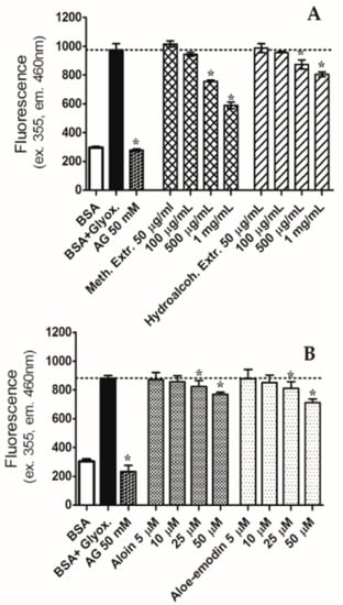 The preparation of glycated BSA was performed according to a previously described method, with minor modifications [49]. Shortly, AGEs, which are the product of glycation, were determined using BSA, as protein substrate, and glyoxal, as glycating agent. The solutions of substrates were added with each extract (50, 100, 500, and 1000 µg/mL), or aloe-emodin or aloin (5, 10, 25 and 50 µM), and incubated at 37 °C for 7 days. After that time, the fluorescence measurement allows the calculation of glycation inhibition as per cent difference between control condition and glycation in the presence of the samples. Aminoguanidine (50 mM, AG) was used as positive control.