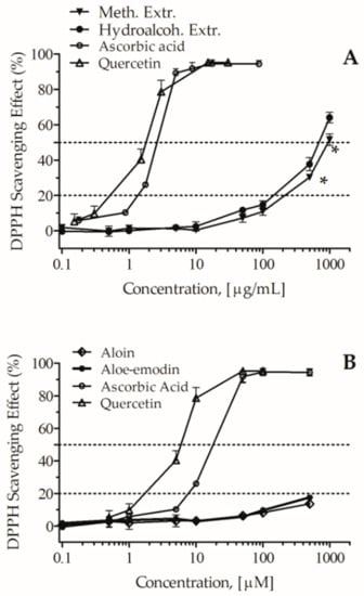 The free-radical scavenging activity of aloin, aloe-emodin, and the two extracts was detected with DPPH assay based on the single electron transfer (SET) mechanism; it is an easy method, largely used to study antioxidant activity [16]. Ascorbic acid and quercetin were used as positive controls. As shown in Figure 3, aloin and aloe-emodin exhibited weak scavenging effects, 20% inhibitory concentration (IC20) >0.5 mM, whereas both the methanolic and the hydroalcoholic extracts showed significant DPPH radical scavenging effects; at the concentration of 1 mg/mL, quenching activities were respectively of 51.5 ± 3.2% and 64.0 ± 2.9%; the estimated half maximal inhibitory concentration (IC50) values were 1.0 mg/mL and 0.66 mg/mL (p < 0.05), respectively. These results suggest that the antiradical activities of the extracts are likely not due to the presence of the two anthraquinones because these ones showed only very slight activity.