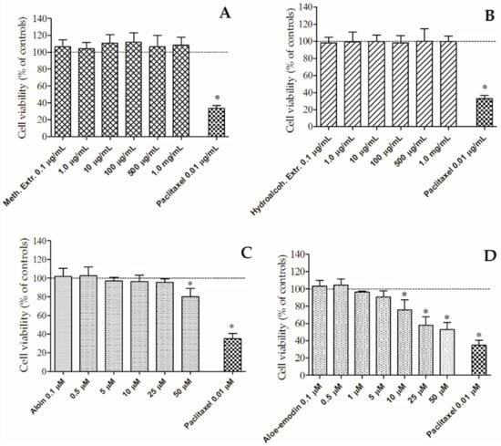 Activity of the methanolic (Meth.) (A) and hydroalcoholic (Hydroalcoh.) (B) extracts, and aloin (C) and aloe-emodin (D) on cellular viability of human colon adenocarcinoma (HT-29) cells. Paclitaxel was used as positive control. Extr: extract. * p < 0.05 vs. controls (cell viability without treatment).