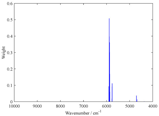 Figure 2 shows the weights and the wavenumbers distribution in the full spectrum of the 15 variables selected at the eighth iteration of the sub-models; it shows the 15 variables selected with their respective weights and the variable with the largest weight and highest importance. By investigating the results in Figure 2, the most informative wavenumbers were finally obtained at around 5900 cm−1. Thus, the 15 variables selected by the BOSS algorithm constituted the best variable subsets for building the final PLS model.