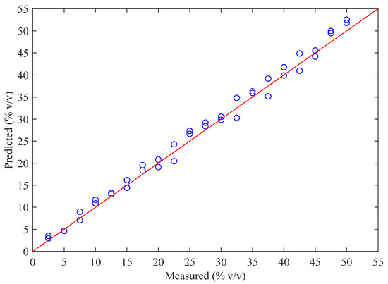 Reference-measured versus FT-NIR-predicted doping concentration of extra virgin olive oil (EVOO) in the validation set.