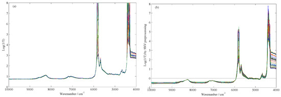 The original FT-NIR spectra (a) and the standard normal variate (SNV) preprocessing FT-NIR spectra (b) of all adulterated EVOO samples.