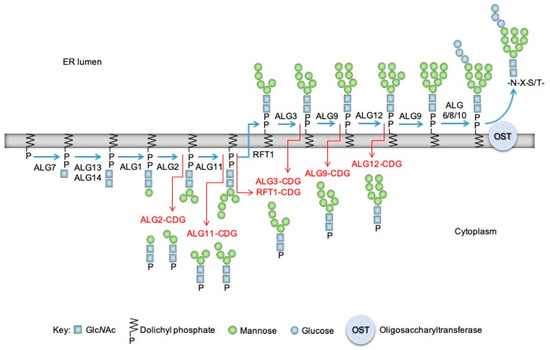 - Péanne, R.; de Lonlay, P.; Foulquier, F.; Kornak, U.; Lefeber, D.J.; Morava, E.; Pérez, B.; Seta, N.; Thiel, C.; Van Schaftingen, E.; et al. Congenital disorders of glycosylation (CDG): Quo vadis? Eur. J. Med. Genet. 2018, 61, 643–663. [Google Scholar] [CrossRef] [PubMed]
