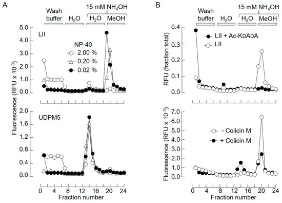 (A) Solid-phase extraction of lipid II and uridinyl diphospho (UDP)-MurNAc pentapeptide (UDPM5) from detergent-containing mixtures. (B) 500 pmol LII(Lys)55 (upper panel) or UDPM5 (lower panel) was incubated with Vm-beads in Vm wash buffer containing the indicated amounts of nonyl phenoxypolyethoxylethanol (NP-40). The beads were then washed with the indicated solutions and fractions were collected into 96-well plates and monitored for fluorescence. (B, upper panel) 500 pmol LII(Lys)55 was incubated with Vm-beads in the presence of 1.5 µmol (3000-fold excess over lipid II and ~50-fold excess over vancomycin attached to beads) acetyl-Lys-D-Ala-D-Ala (Ac-KDADA). (B, lower panel) 500 pmol LII(Lys)55 was incubated in either the absence or presence of colicin M as described in Section 4. The reaction mixtures were subjected to solid-phase extraction as described above.