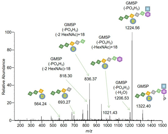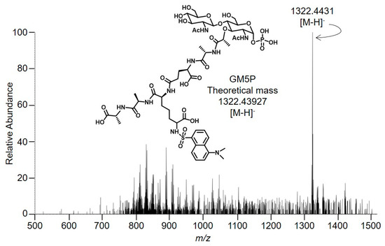 The major signal (z = 1, 1322.4431) is compatible (mass error: 2.90 ppm) with the presence of GlcNAcβ1,4MurNAc(pentapeptide)-P (GM5P, Figure 5 inset). The observed isotopolog distribution of this component (upper panel of Figure S1, Supplementary Materials) is similar to the theoretical isotopolog distribution (lower panel of Figure S1, Supplementary Materials) that was calculated for GM5P [21]. Signals compatible with the presence of either GlcNAcβ1,4MurNAc(pentapeptide)-PP or GlcNAcβ1,4MurNAc-pentapeptide were not detected (Figure 5). In addition, signals corresponding to compounds missing the residue of N-acetylglucosamine (M5PP, M5P, and M5) were not detected (Figure 5). Finally, in order to obtain more structural information about the compound that gave rise to the major signal in Figure 4, MS/MS was performed as shown in Figure 6.