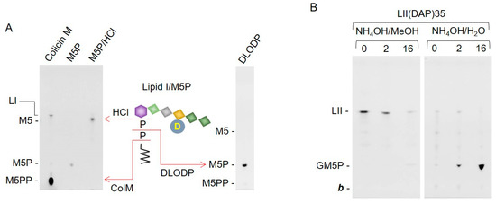 Lipids I or II (500 pmol) were incubated with 3 µg of recombinant colicin M [20] in 50 µL of a buffer containing 50 mM TrisHCl pH 7.4, 150 mM NaCl, 20 mM MgCl2, and 0.12% NP-40 for 16 h at 37 °C [20]. The reaction mixtures then underwent SPE using Vm-beads as described above.