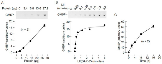 Biochemical characteristics of rat liver lipid II hydrolyzing activity. (A) LII(DAP)35 (500 pmol) was incubated with different quantities of detergent-solubilized rat liver microsomal proteins for 4 h. After SPE, the 15 mM NH4OH/H2O eluates were dried under vacuum and analyzed by TLC. The resulting fluorograms were scanned and GM5P was quantitated as described in Section 4. The means and SDs of duplicate incubations were generated using Prism software. One of the fluorograms is shown. (B) 27.2 μg of detergent-solubilized rat liver microsomal proteins was incubated for 4 h with increasing quantities of LII(DAP)35, (LII nmol), and GM5P was quantitated as described above. A single experiment was performed. (C) LII(DAP)35 (500 pmol) was incubated with 27.2 μg of detergent-solubilized rat liver microsomal proteins for the indicated times. GM5P was quantitated as described above.