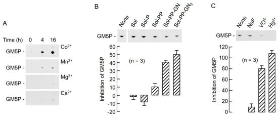 Biochemical profile of LII hydrolyzing activity. (A) Rat liver microsomes were solubilized in buffers containing 1 mM CoCl2 (Co2+), MnCl2 (Mn2+), MgCl2 (Mg2+), or CaCl2 (Ca2+). The extracts (20 μg) were incubated with 500 pmol LII(DAP)35 for the indicated times, and, after SPE, the 15 mM NH4OH eluates were dried down and analyzed by TLC. The migration position of GM5P is indicated to the left of the fluorograms. (B) LII(DAP)35 (500 pmol) was incubated with 27.2 μg of detergent-solubilized rat liver microsomal proteins in the presence of 2.5 nmol solanesol (Sol), solanesyl-P (Sol-P), solanesyl-PP (Sol-PP), solanesyl-PP-GlcNAc (Sol-PP-GN), or solanesyl-PP-GlcNAc2 (Sol-PP-GN2) for 4 h as described in Section 4. GM5P was quantitated as detailed above, and is expressed as a percentage of the quantity of GM5P generated in the absence of the solanesyl compounds (None). (C) Incubations were conducted exactly as described for (B) in the absence of additions (None) or presence of either 50 mM sodium fluoride (NaF), 5 mM sodium orthovanadate (VO4−), or 1 mM mercury chloride (Hg2+). GM5P was quantitated and expressed as for (B).