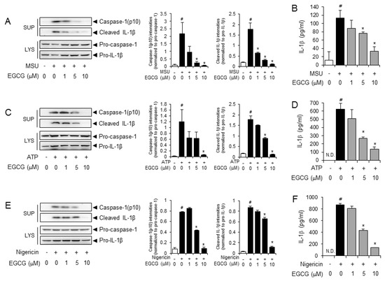 This was performed as previously described []. BMDMs were plated in 6-well plates at a density of 2 × 106 cells/mL and primed with LPS (500 ng/mL for MSU crystals stimulation; 100 ng/mL for ATP, and nigericin stimulation) for 4 h. To exclude the effect of EGCG on the LPS priming step, EGCG was added after washing out the LPS with phosphate-buffered saline (PBS). The cells were treated with EGCG for 1 h and stimulated with NLRP3 inflammasome activators such as MSU crystals, ATP, and nigericin in the presence or absence of EGCG in serum-free medium. The cells were lysed in radioimmunoprecipitation assay (RIPA) buffer (50 mM Tris-HCl, pH 7.4, 1% NP-40, 0.25% sodium deoxycholate, 150 mM NaCl, 1 mM EGTA, 1 mM PMSF, 1 mM Na3VO4, 10 μg/mL aprotinin, and 10 μg/mL leupeptin). The degradation of pro-caspase-1 to caspase-1(p10) and the cleavage of pro-IL-1β to IL-1β in the supernatants were regarded as indicators of inflammasome activation and were determined by immunoblot assays.