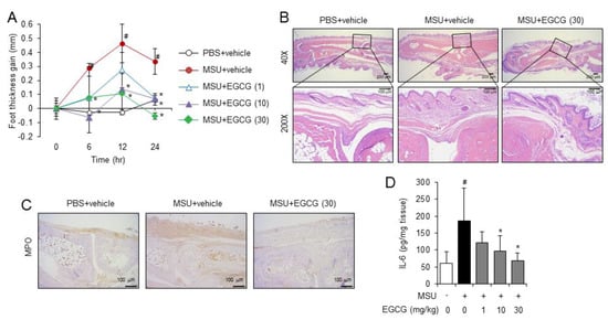 Oral administration of EGCG suppresses acute gout symptoms induced by MSU crystal injection in mice. Mice were orally administered EGCG (1, 10, and 30 mg/kg) or vehicle (0.02% dimethyl sulfoxide (DMSO) in water). After 1 h, MSU crystals (2 mg/0.1 mL of phosphate-buffered saline (PBS)/mouse) or PBS was subcutaneously injected into the footpad of the right hindfoot of each mouse. After 24 h, the footpad tissues were collected for further analysis. (A) Time course of footpad thickness gain compared with the footpad thickness at the 0 h time point per group. (B) Representative picture of hematoxylin and eosin staining of the hind feet. Infiltrating neutrophils in the hindfoot tissue appear as purple dots. (C) Representative pictures of immunohistochemistry staining of foot tissues with myeloperoxidase (MPO) (200×). (D) Supernatants of the foot tissue homogenates were analyzed for IL-6 by ELISA. The values in the line and bar graphs represent the means ± SD (n = 6 mice/group). #, significantly different from vehicle group, p < 0.05; *, significantly different from MSU alone, p < 0.05.