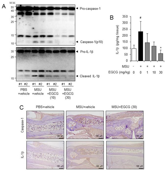 We examined whether EGCG suppresses NLRP3 inflammasome activation in foot tissues injected with MSU crystals. Injection of MSU crystals induced the cleavage of pro-caspase-1 to caspase-1(p10) and the cleavage of pro-IL-1β to IL-1β in the foot tissue homogenates (Figure 3A). The oral administration of EGCG prevented the cleavage of pro-caspase-1 to caspase-1(p10) and of pro-IL-1β to IL-1β in the foot tissues injected with MSU crystals (Figure 3A). EGCG decreased MSU crystal-induced IL-1β production in foot tissue homogenates as determined by ELISA (Figure 3B). Immunohistochemical analysis of the mouse foot tissues with anti-caspase-1 and IL-1β antibody staining showed that the levels of caspase-1 and IL-1β were increased in the foot tissues injected with the MSU crystals, while oral administration of EGCG reduced the increased levels of caspase-1 and IL-1β in gouty foot tissues (Figure 3C).