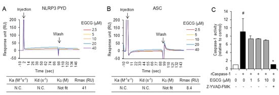 EGCG does not directly associate with NLRP3 and apoptosis-associated speck-like protein containing a CARD (ASC) or inhibit caspase-1 enzyme activity. (A,B) Sensorgrams were obtained by SPR analysis to determine the interaction between EGCG and recombinant (A) NLRP3-PYD or (B) ASC. Different concentrations of EGCG are presented as an overlay plot aligned at the start of injection. Table of kinetic parameters obtained from the SPR analysis and calculated by Biocore T200 evaluation software. (C) An in vitro assay for caspase-1 enzymatic activity was performed using a fluorometric caspase-1 assay kit with recombinant caspase-1 (rCaspase-1) in the presence or absence of EGCG or Z-YVAD-FMK. The values represent the means ± SD (n = 3). #, significantly different from vehicle, p < 0.05; *, significantly different from rCaspase-1 alone, p < 0.05.