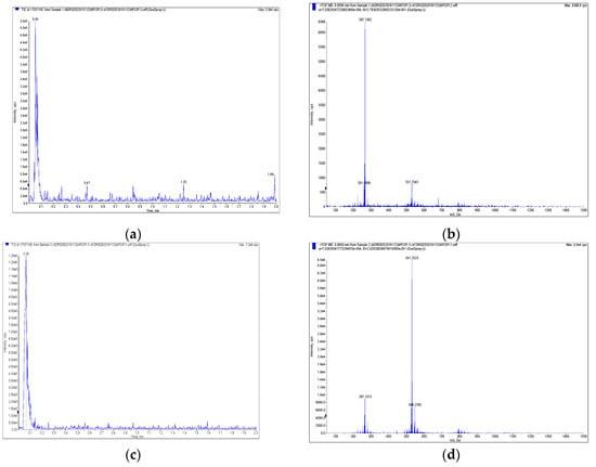 The identification of magnolol and honokiol by high-performance liquid chromatography/mass spectrometry (HPLC/MS) chromatogram. (a,b) Magnolol; (c,d) honokiol.