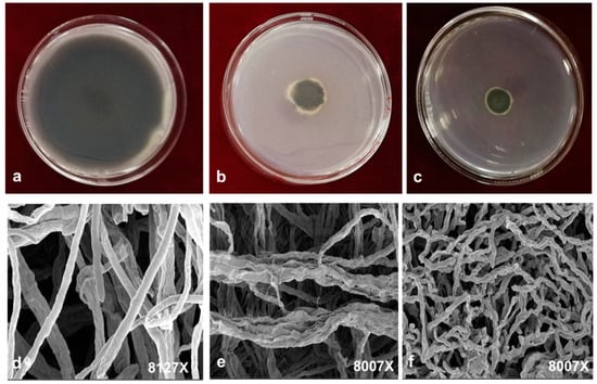 Observation of hyphae morphology of A. alternata by electron microphotography. The colony of A. alternata on PDA plates is shown in (a–c): (a). Control PDA plate; (b). PDA plate containing magnolol (0.1 mg/mL); (c). PDA plate containing honokiol (0.1 mg/mL). Hyphae morphology of A. alternata on the PDA plate is shown in (d–f): (d). Control PDA plate; (e). PDA plate containing the magnolol (0.1 mg/mL); (f). PDA plate containing honokiol (0.1mg/mL).