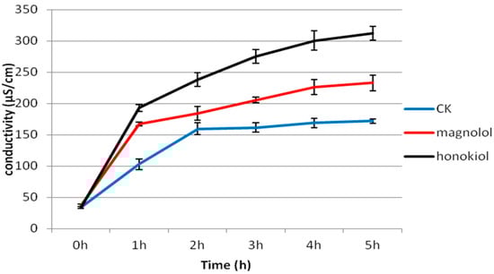 Effects of magnolol and honokiol on the extracellular conductivity of A. alternata, CK:PDB medium containing the same volume of Tween-20 and distilled water (1:1000 v/v).