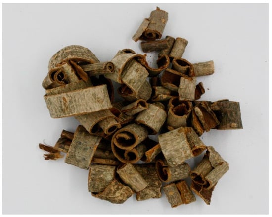The stem bark of M. officinalis was rolled up into a column, brown and spicy (Figure 6). With the method of alkali-extraction and acid-precipitation, 100 g of dried bark was ground into powder by a disintegrator XL600B (Xiaobao Electric Co. LTD, Yongkang, China), and extracted three times with 90% methanol. The resulting crude extract (1500 mL) was dried to a paste and then incubated with two times quicklime for 24 h. After washing three times using five times diluted hydrochloric acid, the extract paste was concentrated. After the concentrating step, the extract was dissolved in chloroform and isolated with three volumes of alkaline water (0.5% NaOH solution). The crystals were filtered out from the solution by adjusting the pH value to 7. After drying at a low temperature, the solution that was filtered from the crystal with petroleum for 1 h was naturally cooled to room temperature, and the final product was analyzed by a liquid chromatography-mass spectrometry (LC-MS). The structures were identified by 1H and 13C-NMR spectra. 1H and 13C-NMR spectra were obtained with Bruker Avance III 500 MHz (Bruker Corporation, Karlsruhe, Germany). HPMS were recorded on a Triple TOF 5600+ system (AB SCIEX Co. LTD, Framingham, MA, USA). The high-performance liquid chromatography was performed on an Agilent 1260 liquid chromatography system (Agilent Technologies Co. LTD, Santa Clara, CA, USA) equipped with a Zorbax SB-C18 column, particle size 5 μm, dimension 150 mm × i.d. 9.4 mm, flow rate 7 mL min−1.